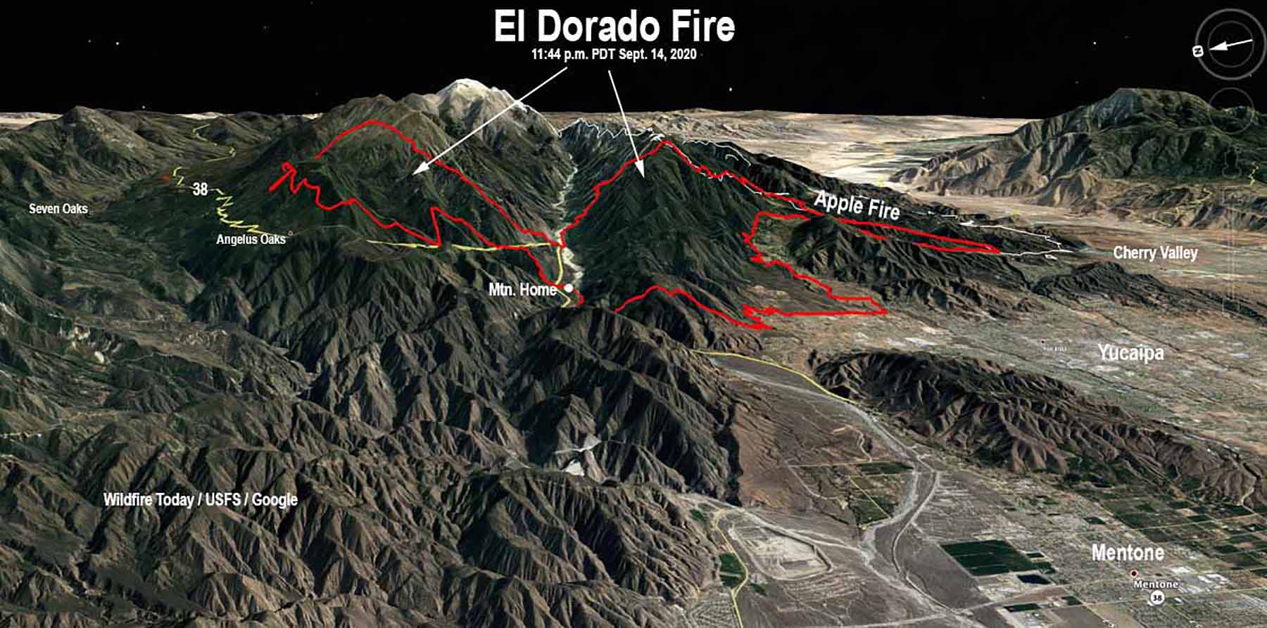 Despite the fact that this map is from 9/14/20, it can give you a really good idea of where the fire is and how much area it is encompassing. Fire lines continue to hold both in Angelus Oaks and near camp. Let’s hope that the winds tonight keep driving the fire into the lower region of the Lake Fire burn area which should help reduce the amount of fuel feeding the fire.