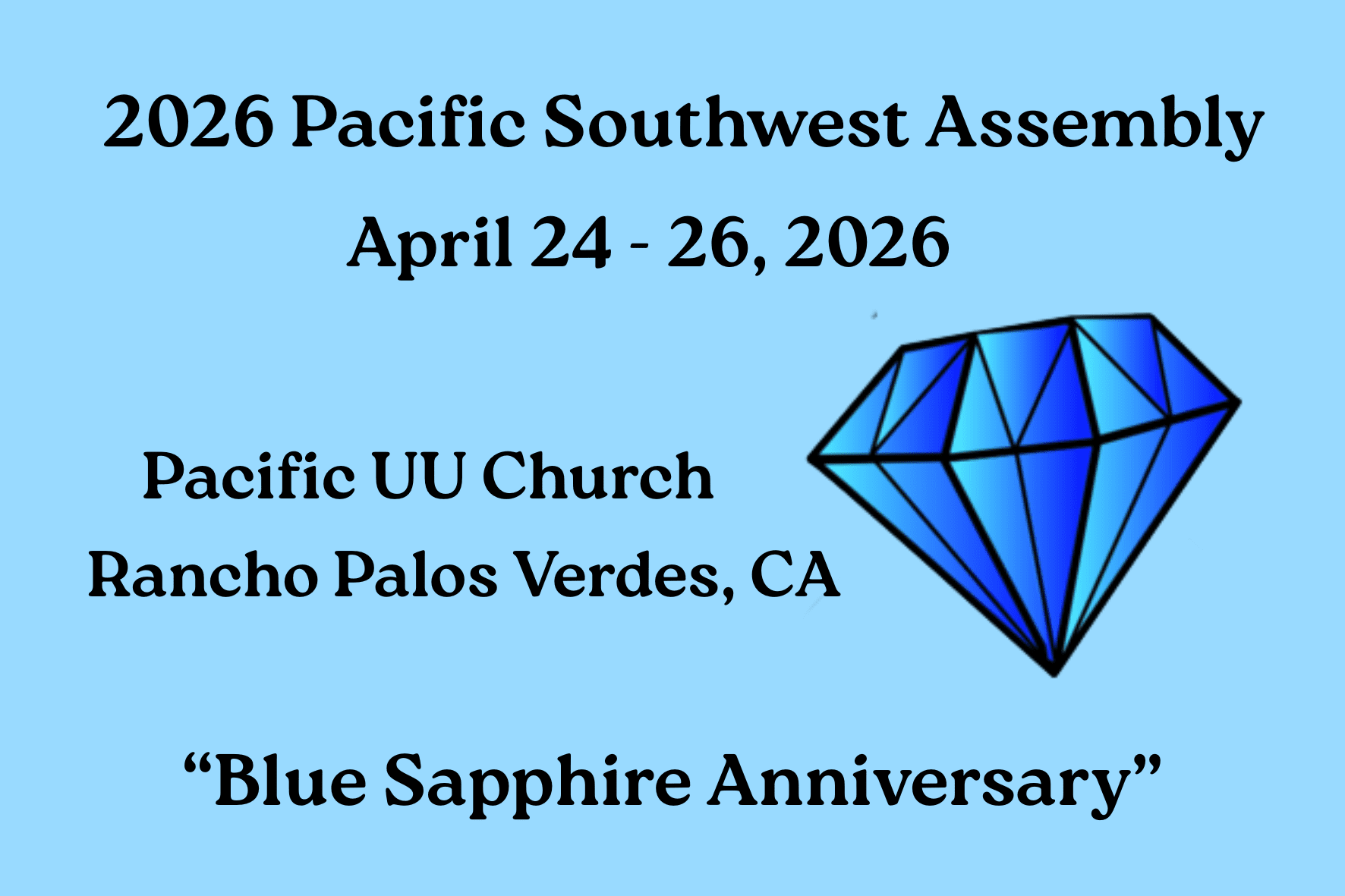 Save The Date for the Pacific Southwest Assembly, April 24-26, 2026, at the Rancho Palos Verdes, Unitarian Universalist (UU) campus. The Pacific UU Church is located South of Los Angeles and West of Long Beach and is central for those traveling in most directions. In the spirit of the former district assembly, we invite UUs and affiliated people to join in our Blue Sapphire reflection – 65 years of UU history – with a look ahead as we strive for Justice.