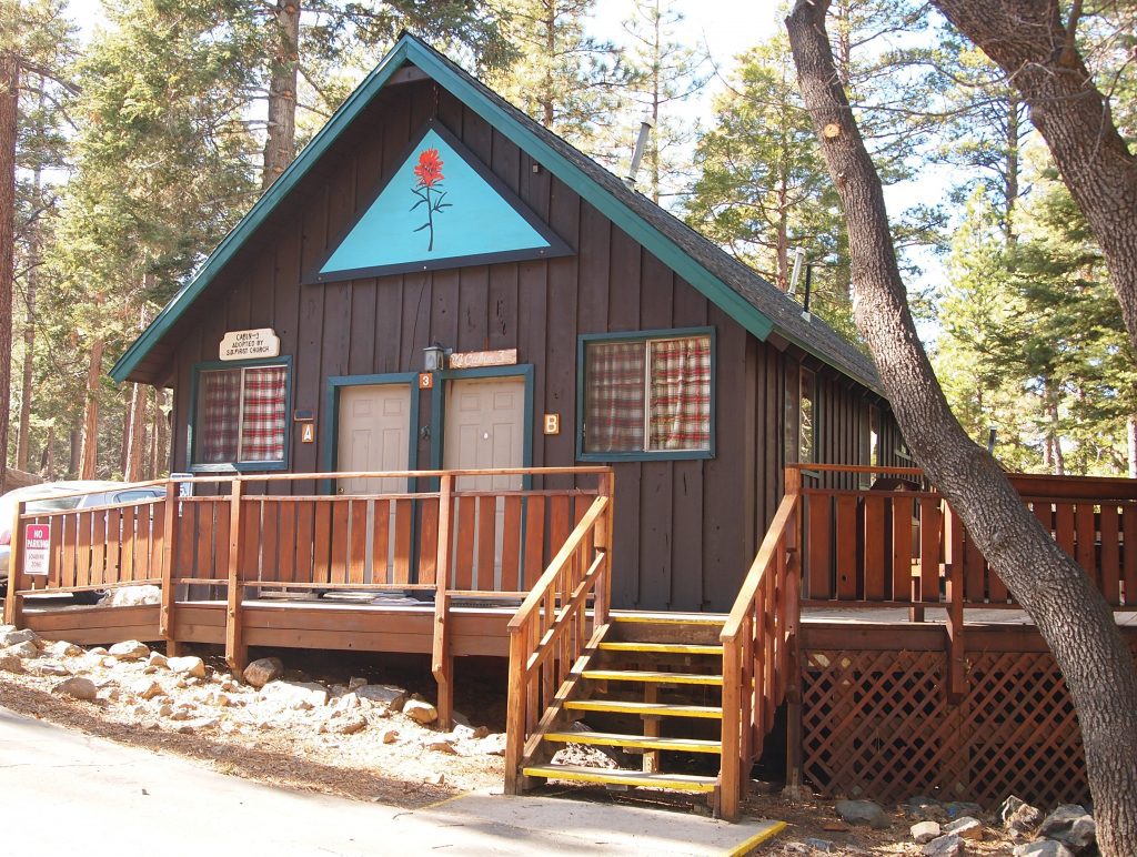 Cabin 3 is nestled up against the forest on the west side of camp. In addition to its seclusion, the cabin boasts two decks, a ramp, stairs, and four separate entries! The interior of the cabin is decorated with original artwork of local flora. It also include three rooms, each with three bunk beds, and one room with two bunks. For privacy, there are two rooms with a toilet and sink in each and two separate shower rooms. Click on the photo to view the floor plans.
