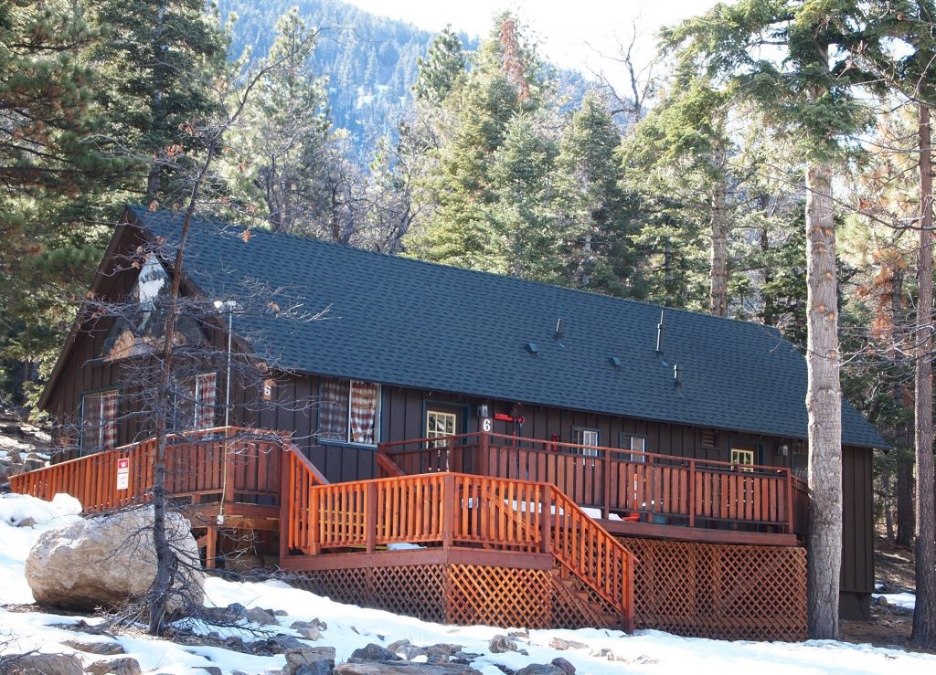 The second most popular Cabin at de Benneville Pines, Cabin 6 is more private and isolated than most other cabins on the property. It boasts a large living and dining area, a full kitchen with a refrigerator and stove, a TV/VCR, and comfortable seating including a wrap-around couch. Cabin 6 can house up to 3 families and total of 12 people. Each of the three bedroom has two bunks. There are also two bathrooms with showers. Across its length, Cabin 6 features a large deck with benches and two separate entryways, one at each end.